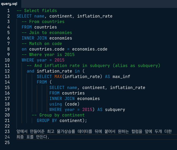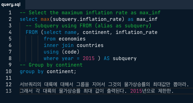 [datacamp] subqueryData Engineering/SQL 2021. 1. 26. 00:03